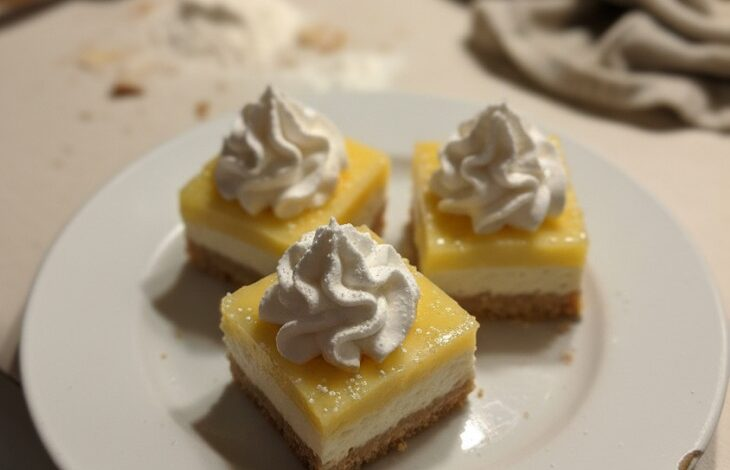 Bright, zesty, and irresistibly creamy—these layered dessert bars bring a burst of sunshine with a buttery graham cracker base and a silky lemon topping. đź›’ What You’ll Need LayerIngredientNotes & TipsBase1 cup graham cracker crumbsCrunchy and comforting foundationÂĽ cup granulated sugarBalances and sweetens the crust½ cup melted unsalted butterAdds richness and binds the crust togetherCream Layer8 oz softened cream cheeseTangy and smooth—let it soften for easy mixing½ cup confectioners’ sugarSweetens without adding texture1 cup whipped toppingMakes the layer light and airyLemon Layer2 cups lemon pie fillingHomemade or store-bought—it’s up to youFinishing TouchesWhipped cream (optional)For extra indulgence when servingLemon slicesDecorative and…