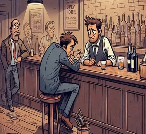 Same stool. Only this time, his shirt was untucked, his eyes rimmed red, and his tie had gone missing somewhere between regret and surrender.