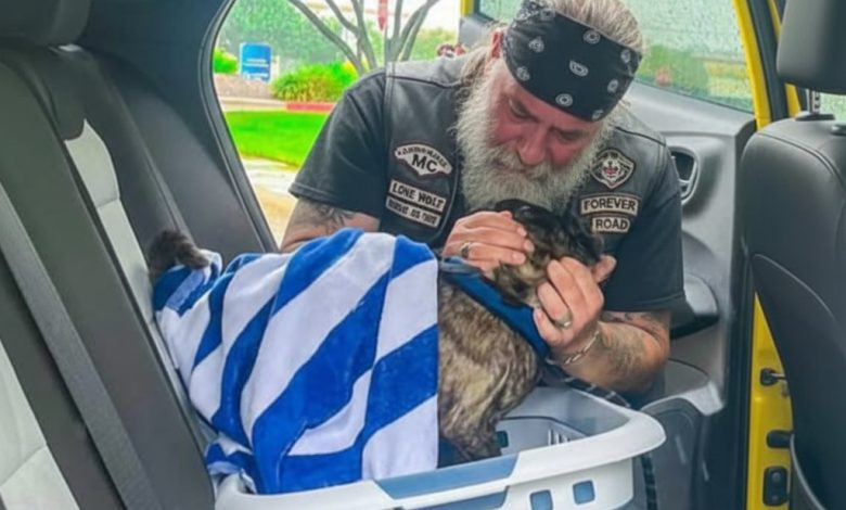 That’s when I saw him. A towering man in a leather vest, kneeling in the ditch, lifting something small and fragile with the kind of care you’d use to hold glass. He wrapped it in a blue-and-white striped towel and cradled it against his chest like it was precious.