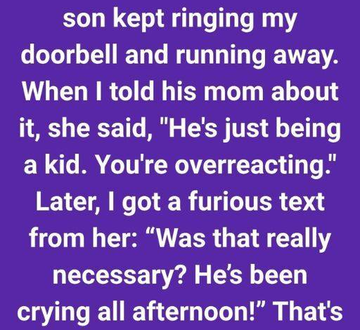 For weeks, my peace was disrupted by a constant irritation: my neighbor’s young son had developed a habit of ringing my doorbell and sprinting away before I could reach the door. The prank—better known as “ding-dong ditch”—went from mildly annoying to genuinely disruptive faster than I expected. When I first mentioned it to his mother, she brushed it off. “He’s just being a kid. You’re taking it too seriously,” she said with a shrug. Her dismissiveness was frustrating, but I stayed polite. Still, everything escalated the moment I gathered proof, which led to a furious message from her later that…