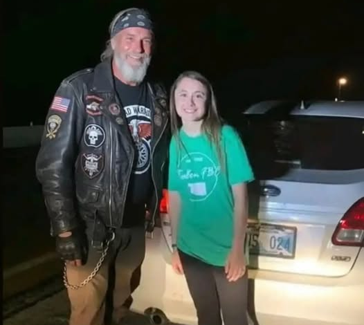 I first spotted the white sedan on the shoulder of Highway 42 a little after 11 PM, its hazard lights flickering weakly like they were running out of strength. My original plan was to keep riding. It was late, my body ached, and I still had a long road ahead of me. But then my headlight swept across the scene, and I caught sight of her. A teenage girl—fifteen, maybe sixteen—crouched beside the rear wheel with a tire iron clutched tight in her hands. She was crying, shoulders shaking, and her eyes kept darting toward the woods bordering the highway…