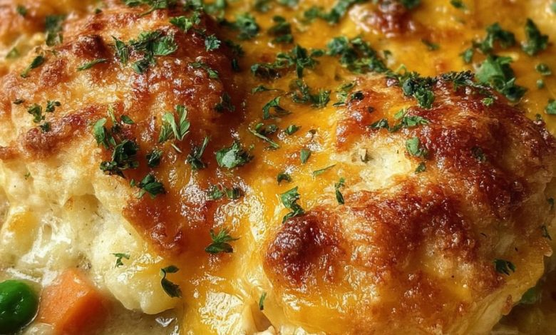 Tender shredded chicken, colorful vegetables, and a biscuit topping made from Cheddar Bay biscuit mix come together in a creamy, savory sauce. As it bakes, the top turns golden and cheesy while the filling stays rich and flavorful—a simple, cozy cousin to classic chicken pot pie.