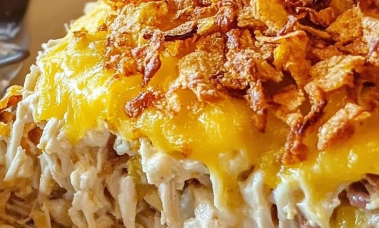 This warm and satisfying casserole combines tender chicken, mixed veggies, and a creamy base, all topped with a buttery, crunchy layer made from cornflakes or crispy fried onions. It’s classic comfort food made easy.