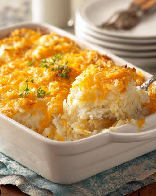 Gently stir in the thawed hash browns, coating them thoroughly. Spread the mixture evenly in your prepared baking dish.