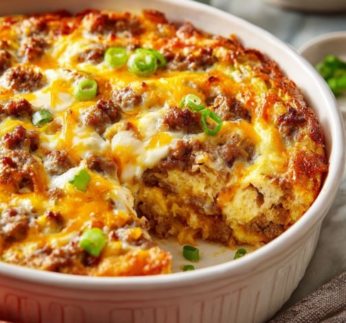 Spread the frozen hash browns evenly across the bottom of the prepared baking dish, pressing them down lightly. Scatter the cooked sausage over the potatoes.