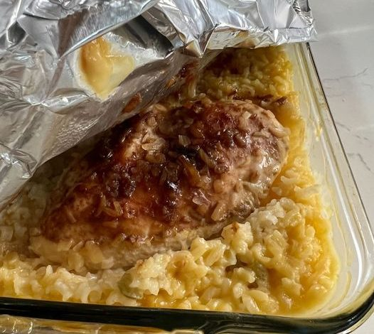 Cover the dish tightly with foil and bake for approximately 90 minutes, or until the chicken reaches an internal temperature of 165°F (74°C) and the rice has absorbed the liquid.