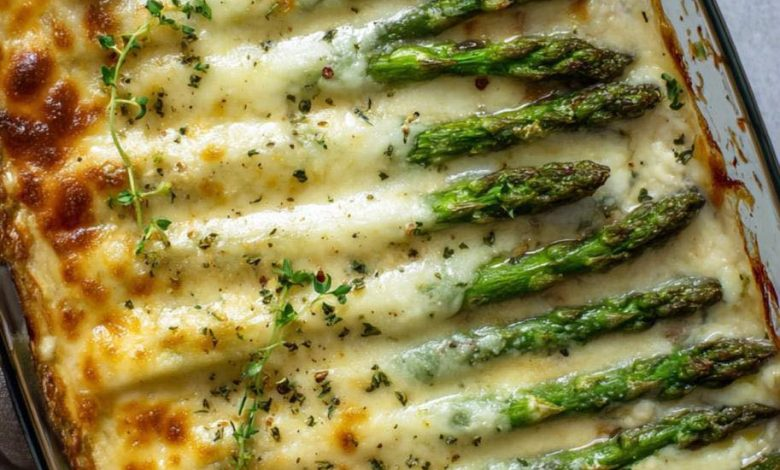 Preheat the oven to 400°F (200°C). Wash and trim the asparagus. Lightly grease a 9×13-inch baking dish and arrange the asparagus in an even layer.