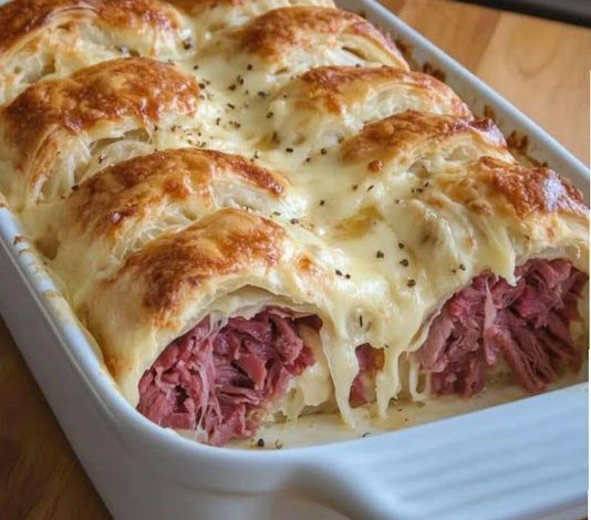 Think of all the comforting, old-school flavors of a traditional Reuben sandwich—savory corned beef, briny sauerkraut, melty Swiss cheese, and creamy Russian dressing—wrapped inside buttery crescent dough and baked into a warm, golden casserole.