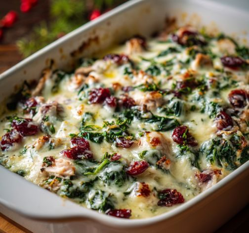 This simple casserole is a cozy way to use leftover turkey, combining it with cranberry sauce, fresh spinach, and gooey mozzarella for a flavorful meal.