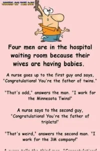 A short time later, the nurse returned to update the second man. “Great news—you’re the father of triplets!” He blinked in shock before replying, “What are the odds? I work for 3M!”