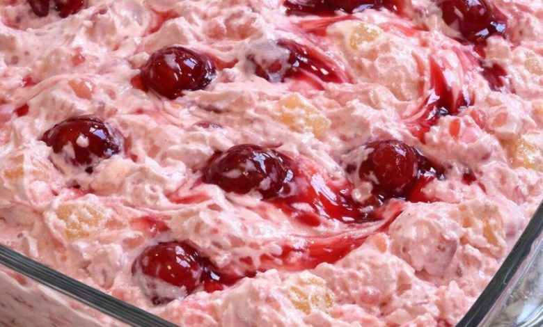 Grandma Jean used to call this her “pantry magic”—a frosty, cloud-like dessert that vanished before the plates were cleared. It’s the perfect last-minute sweet when cravings strike and you’re working with simple shelf staples. Cherry pie filling, crushed pineapple, and sweetened condensed milk blend with whipped topping to form a soft pink, creamy treat swirled with bright cherry streaks. Nostalgic, comforting, and wonderfully simple, it’s a go-to for hectic evenings or casual gatherings.