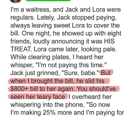 After years in the restaurant business, you develop a sixth sense. You learn to read the silent language between couples—the tenderness, the tension, the quiet unraveling. Jack and Lora were once the kind of regulars who made you smile: fingers intertwined over dessert, laughter that lingered, tips that spoke of generosity. But something shifted. The warmth cooled. The sparkle dimmed. And a troubling pattern emerged—Lora always paid.