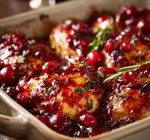 This incredibly simple holiday casserole features juicy chicken baked in a sweet-tangy glaze made with whole-berry cranberry sauce and dry onion soup mix. It’s festive, flavorful, and requires almost no prep.