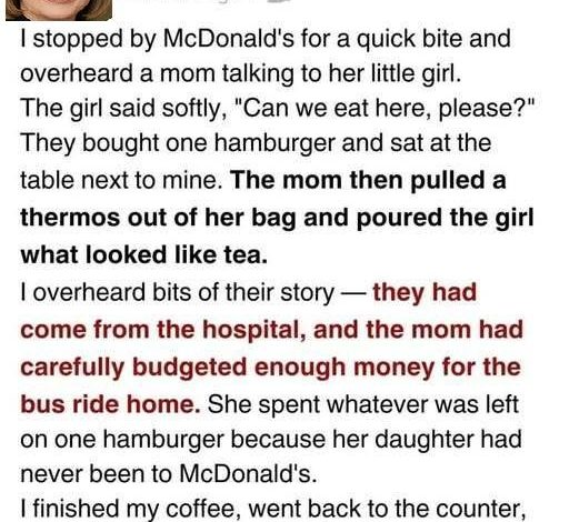 Often, the most powerful lessons in life arrive quietly, tucked into the most ordinary places. One evening, worn down and running on empty, I walked into a nearby McDonald’s. The day had taken everything out of me, and I barely felt present. That’s when I noticed a mother and her young daughter sitting nearby. The mother wore a thin, weathered coat that spoke of many difficult winters. Her daughter’s eyes held a delicate hope—the kind children learn to soften when they sense it may be denied.