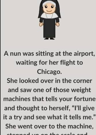 While waiting for her flight to the major city of Chicago, the nun sat in a busy terminal surrounded by the constant movement of passengers. Her attention drifted toward an old-style, coin-operated device—one of those vintage machines that not only gave a person’s weight but also dispensed a printed fortune.