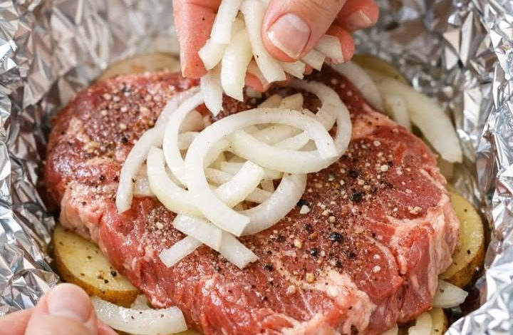 Place a bed of seasoned onions on each foil sheet. Lay a steak portion on top, and drizzle any leftover oil over the meat.