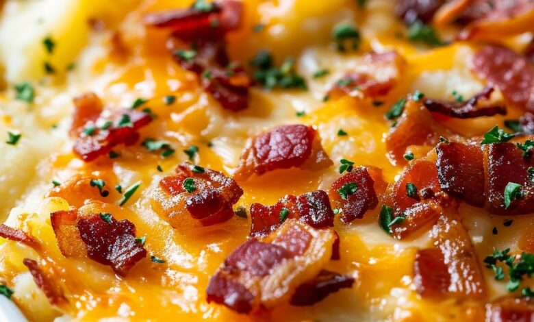 Remove the foil, sprinkle the remaining shredded cheddar (and extra bacon if desired) over the top. Return to the oven and bake uncovered for 20–30 minutes, or until the top is bubbly and golden brown.