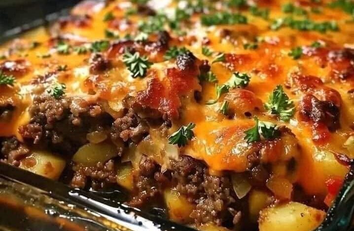 A true comfort food classic, this casserole combines a flavorful, homestyle meatloaf with thinly sliced potatoes, all baked together under a golden layer of melted cheddar. It’s a filling, fuss-free meal perfect for weeknights or family dinners.