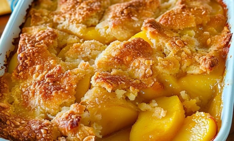 Pour the batter into a greased 9×13-inch baking dish, spreading it evenly across the bottom. Spoon the peach mixture on top, distributing it evenly. Do not mix—the batter will rise around the fruit as it bakes.