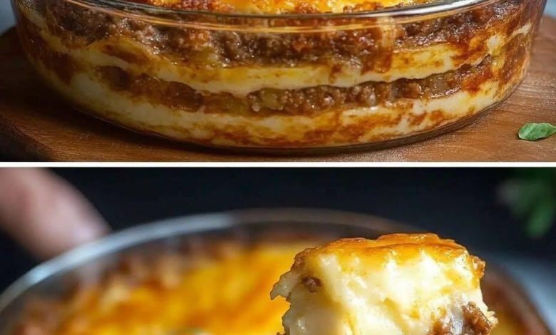 Grease an oven-safe baking dish. Spread half of the cooked pasta evenly across the bottom. Spoon over half of the meat sauce, followed by half of the béchamel. Repeat the process with the remaining pasta, meat sauce, and béchamel.