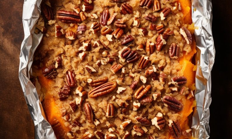Sprinkle the pecan topping evenly over the sweet potatoes. Bake for 30 minutes, or until the topping is golden brown and the casserole is heated through.