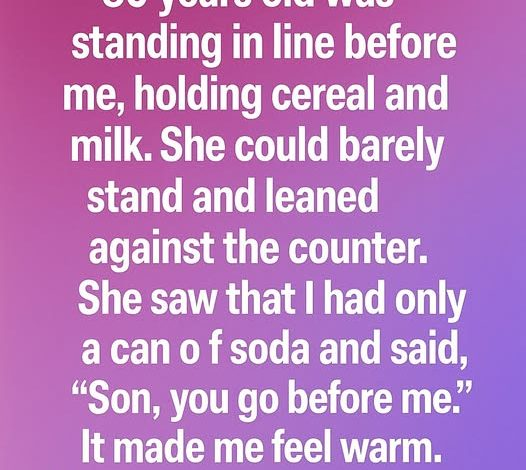A woman close to eighty stood ahead of me in the checkout line, holding a small box of cereal and a carton of milk. She steadied herself against the counter, her age evident in every careful movement. When she noticed I carried only a single can of soda, she smiled kindly and said, “Go ahead of me, son.”