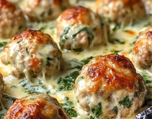 This cozy Southern-inspired dish features juicy, oven-baked chicken meatballs enriched with creamy ricotta and served in a velvety spinach Alfredo sauce. It’s the perfect fusion of comfort and flavor.